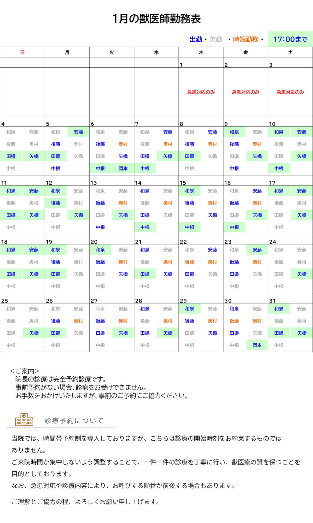 2026年1月の獣医師勤務表[12/23更新] 投稿日 2025年12月15日 更新日 2025年12月23日 著者 栄どうぶつ病院 カテゴリー News 1/12の勤務時間に変更がございます。 勤務獣医師の変更はございません。 よろしくおねがいいたします。