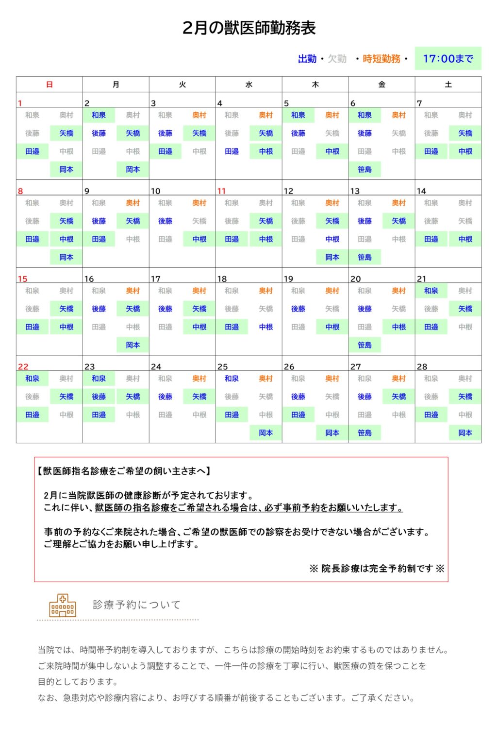 2026年2月の獣医師勤務表 投稿日 2026年1月8日 著者 栄どうぶつ病院 カテゴリー News 獣医師指名診療をご希望の飼い主さまへ 2月に当院獣医師の健康診断が予定されております。 これに伴い、獣医師の指名診療をご希望される場合は、誠に恐れ入りますが、必ず事前の診療予約をお願いいたします。 事前のご予約なくご来院された場合、ご希望の獣医師での診療をお受けできない場合がございます。 皆様にはご迷惑をおかけいたしますが、何卒ご理解とご協力のほどお願い申し上げます。 ご予約はご不明な点がございましたら、お問合せください。