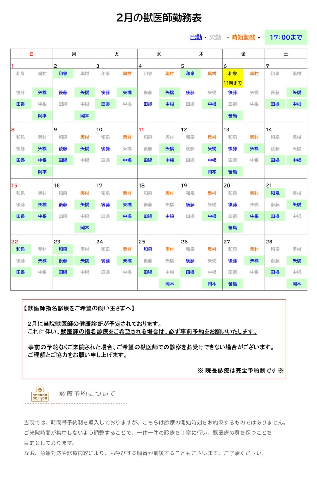 2/6(金)の獣医師和泉の勤務時間に変更がございます。