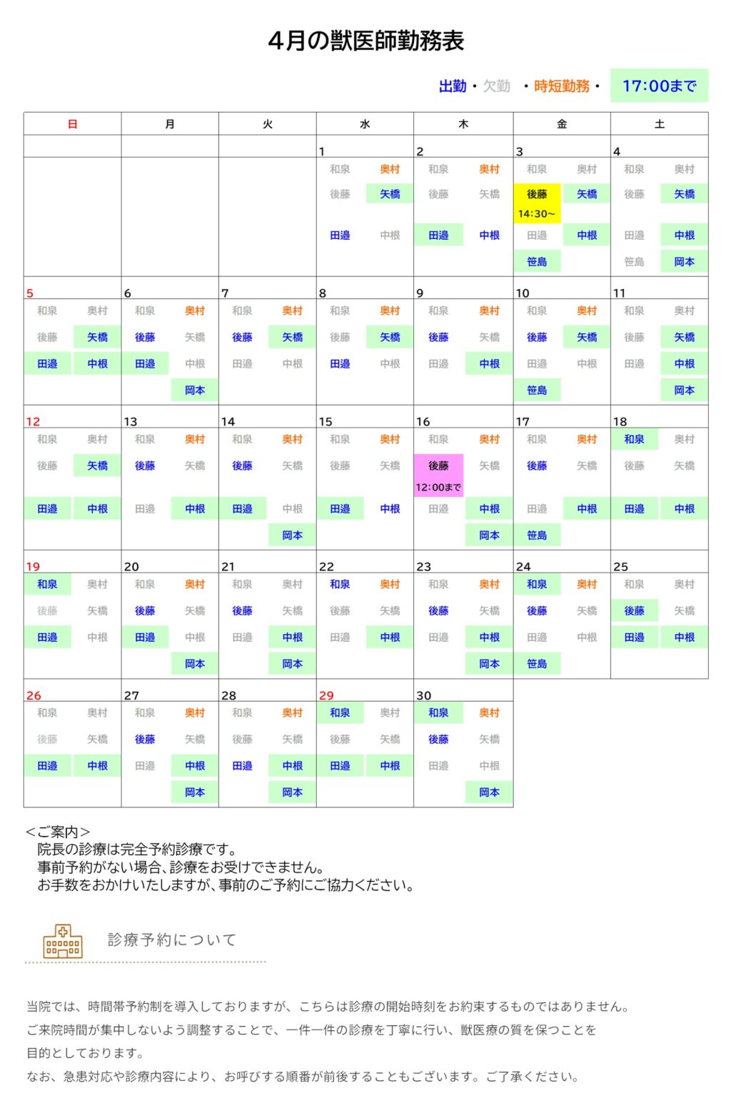 4月の獣医師勤務表ができました。